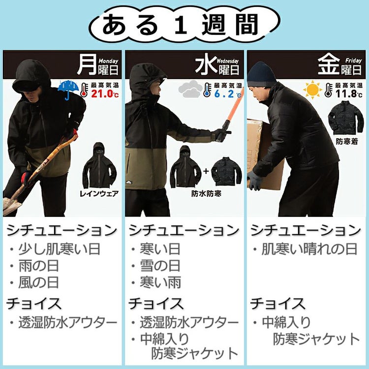 ・ほんのり肌寒い日、雨の日、風の日 →透湿防水アウター1枚