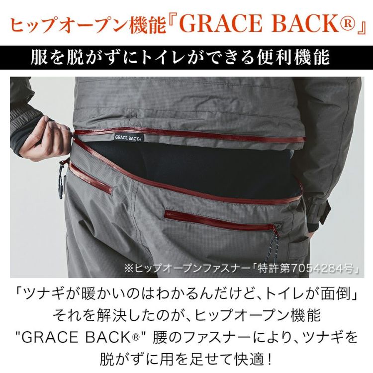 ダウンツナギは暖かいけど、トイレが…なんてお声を良く聞く事があります。 GRACE ENGINEER'Sが特許取得したヒップオープン機能『GRACE BACK』によって、 腰についているファスナーを開くことで、服を脱がずに用を足すことが出来るようになりました! 使用しているファスナーもYKKR製の止水ファスナーだから丈夫で耐久性も◎