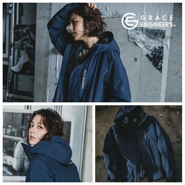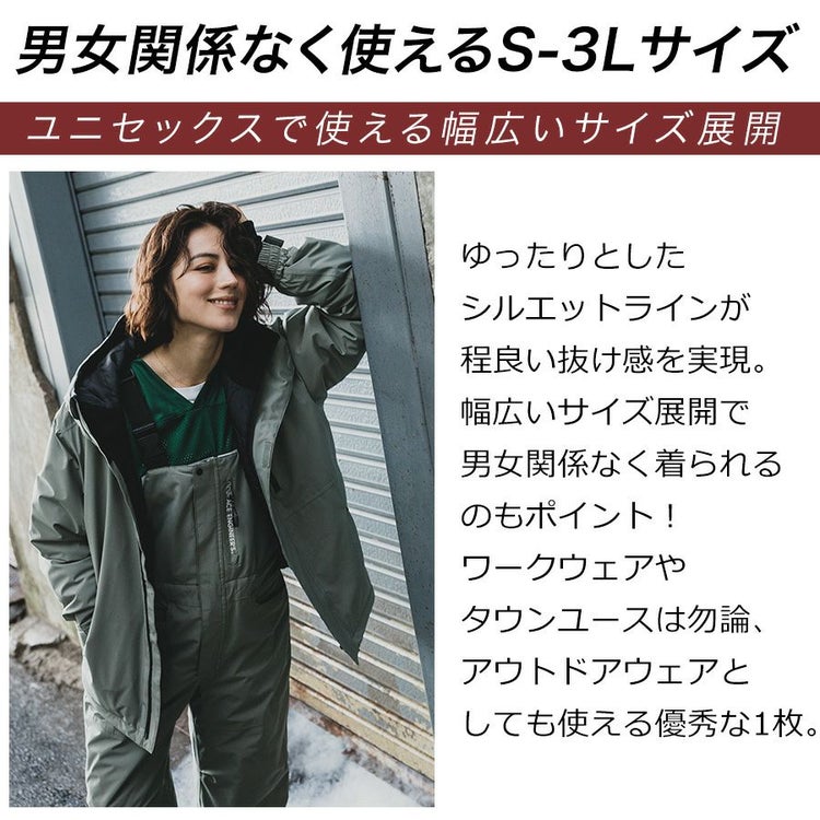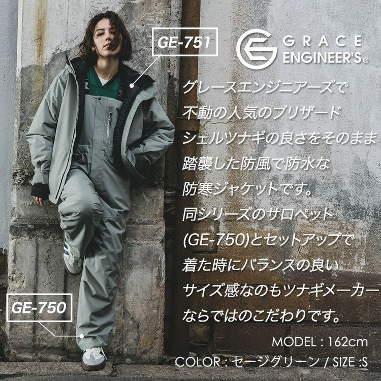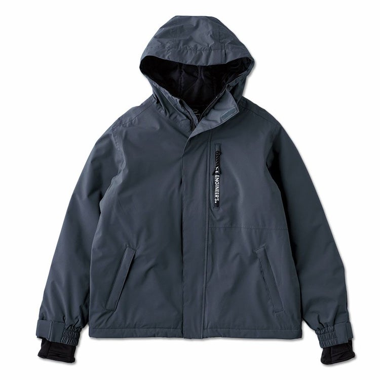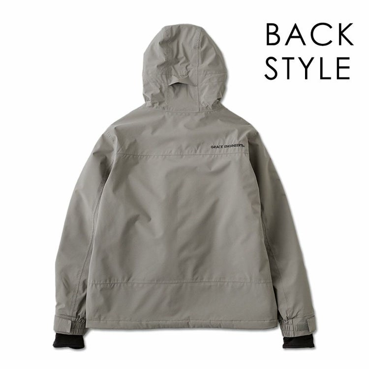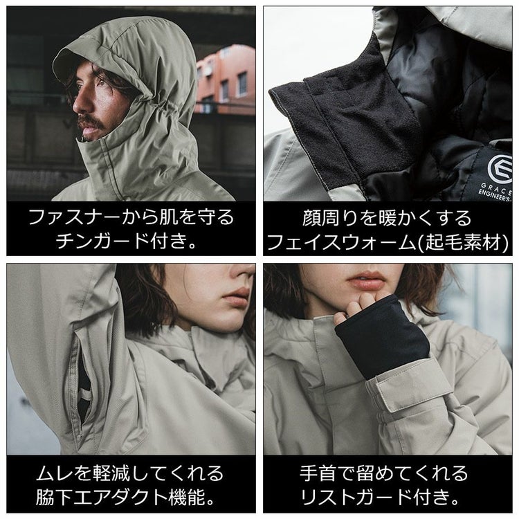 グレースエンジニアーズで不動の人気のブリザードシェルツナギの良さを そのまま踏襲した防風で防水な防寒ジャケットです。同シリーズのサロペット(GE-100%)と セットアップで着た時にバランスの良いサイズ感なのもツナギメーカーならではのこだわりです。