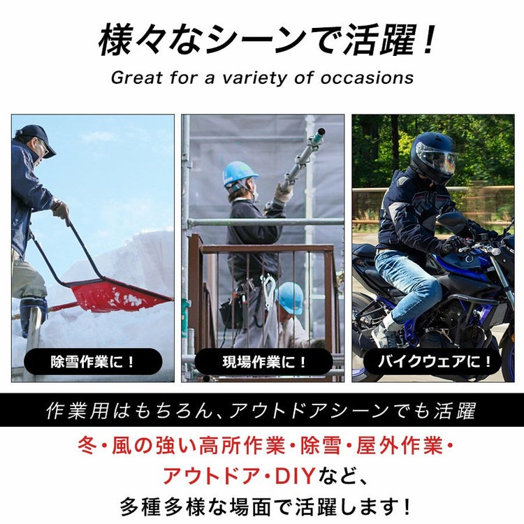 冬・風の強い高所作業・除雪・屋外作業・ アウトドア・DIYなど、 多種多様な場面で活躍します!