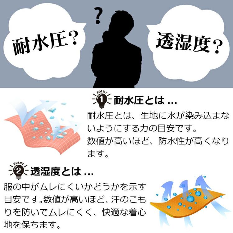 大雨にも対応可能レベルの高い防水性(耐水圧:10,000mm)の他、 ムレを逃がす透湿性(透湿度:20,000g/m2/24h)も高い数値を誇ります。