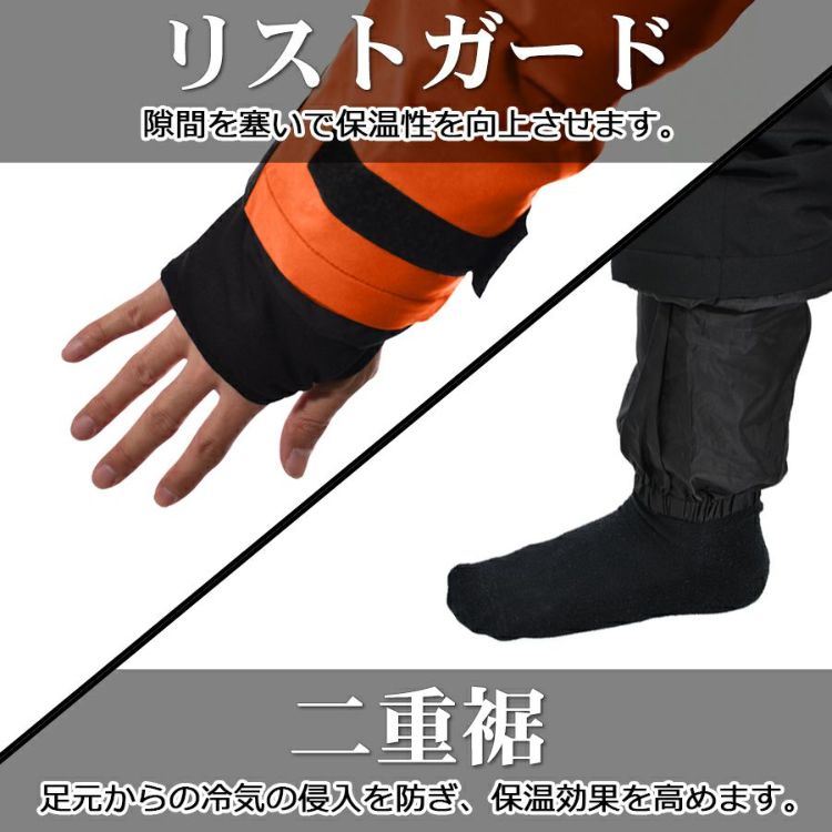 ・手首・足首からの冷気の侵入を防ぐ仕様。(リストガード・二重裾)