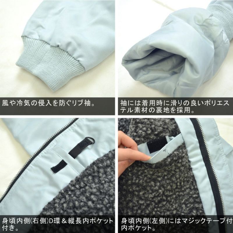 防寒着の裏地は全面ツルツル素材のものが多いので、着用する際にヒヤッと冷たく感じることが多いですが、 こちらの商品は身頃がボアなので肌あたりが暖かく、着た瞬間に冷たさを感じることなく暖かく着用頂けます!