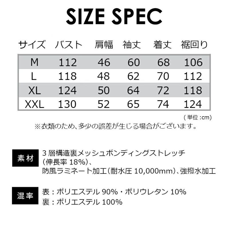 防風ラミネート加工(耐水圧10,000mm)、強撥水加工