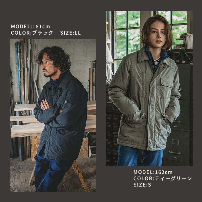 ツナギに合わせた際にマッチする絶妙な丈感や動きやすさを考えたラグラン袖といった仕様に加え、大型のポケットなどの豊富な収納面に手首の冷えを防ぐ袖リブ仕立てと充実のディテール。
