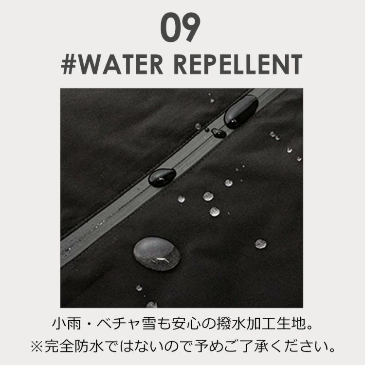 表生地は耐久撥水加工を施し、洗濯後も撥水力が持続します。(防水ではありません) 縫い目には防水加工をしていませんので完全防水ではありませんが、 小雨やベチャ雪などの日も安心して着用頂けます。 ※長時間濡れ続けると縫い目から浸水する可能性がございますのでご注意ください。 同時に防風性も備えており、冷気をシャットアウトすることで暖かさを保ちます。