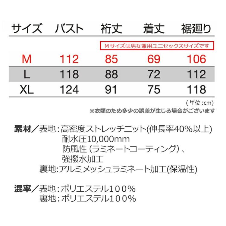 ★防水、防風性に優れるラミネート加工とライニングアルミメッシュ素材が保温性を確保