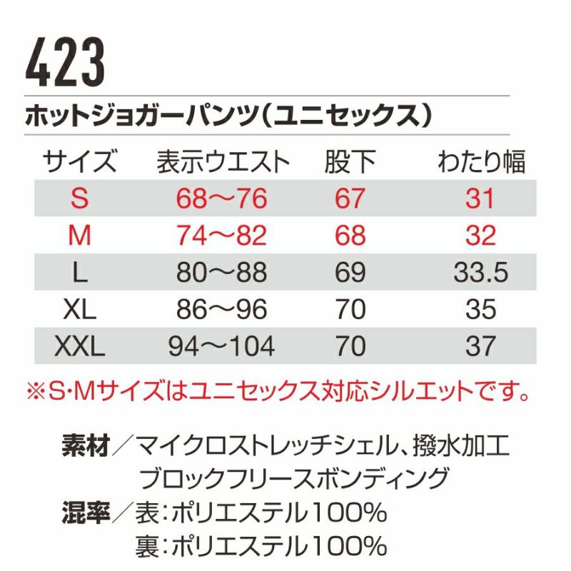【XXL】「BURTLE(バートル)」裏フリース ホットジョガーパンツ/423 防寒 冬用 ストレッチ 作業ズボン 作業服 作業着