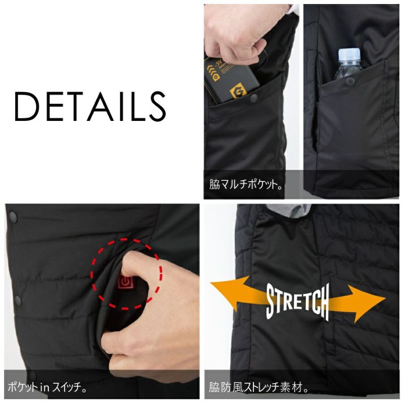 電熱シート付き(背中上部、両脇腹部)。3段階温度調節。脇防風ストレッチ素材。ポケットinスイッチ。
