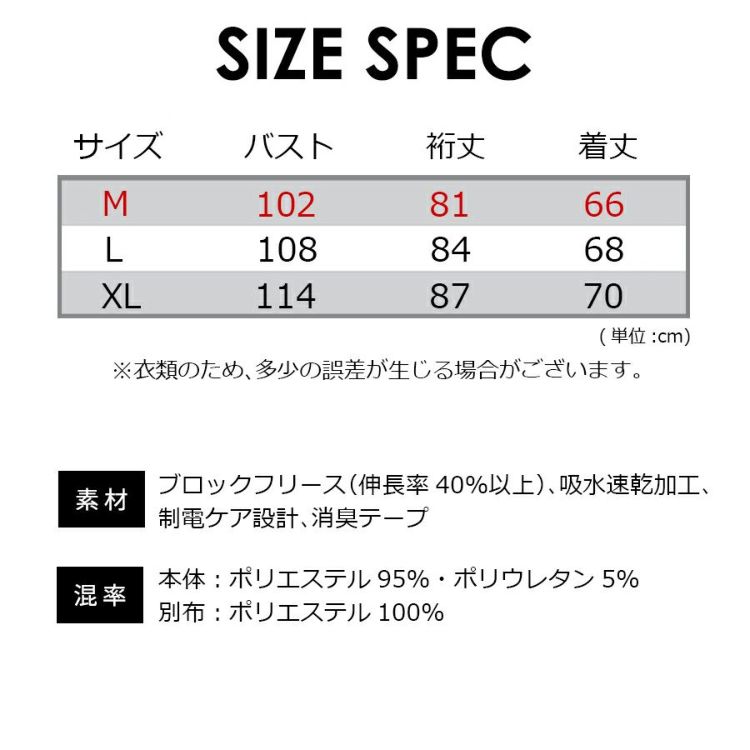 素材/ブロックフリース(伸長率40%以上)、吸水速乾加工、制電ケア設計、消臭テープ
