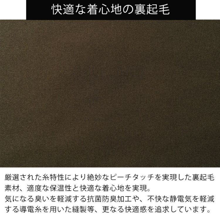 ■厳選された糸特性により絶妙なピーチタッチを実現した裏起毛素材、適度な保温性と快適な着心地を実現。