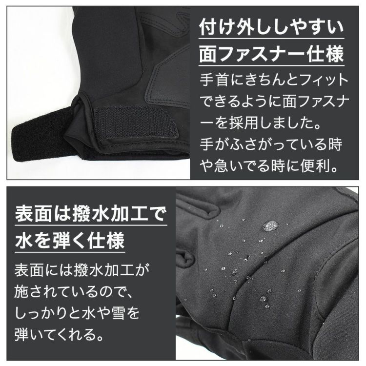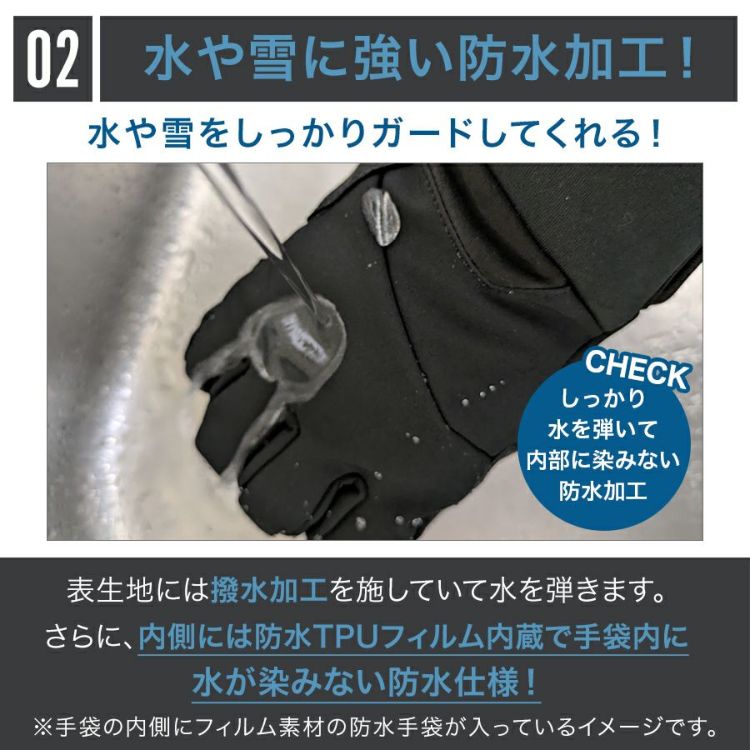 防水TPUフィルムを内側に内臓しており、手袋内に水が染みない防水仕様で、冬の雨やベチャ雪でも安心してお使い頂けます。