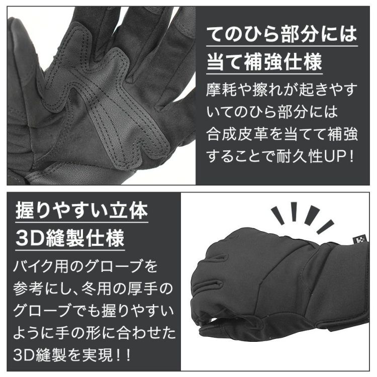 機能性&防寒性の高い手袋は様々なシーンでの活躍が期待できます。 屋外作業全般、雪かき、冬キャンプ、スクーターや原付バイク、通勤・通学にもおすすめの小物となります。