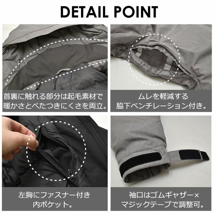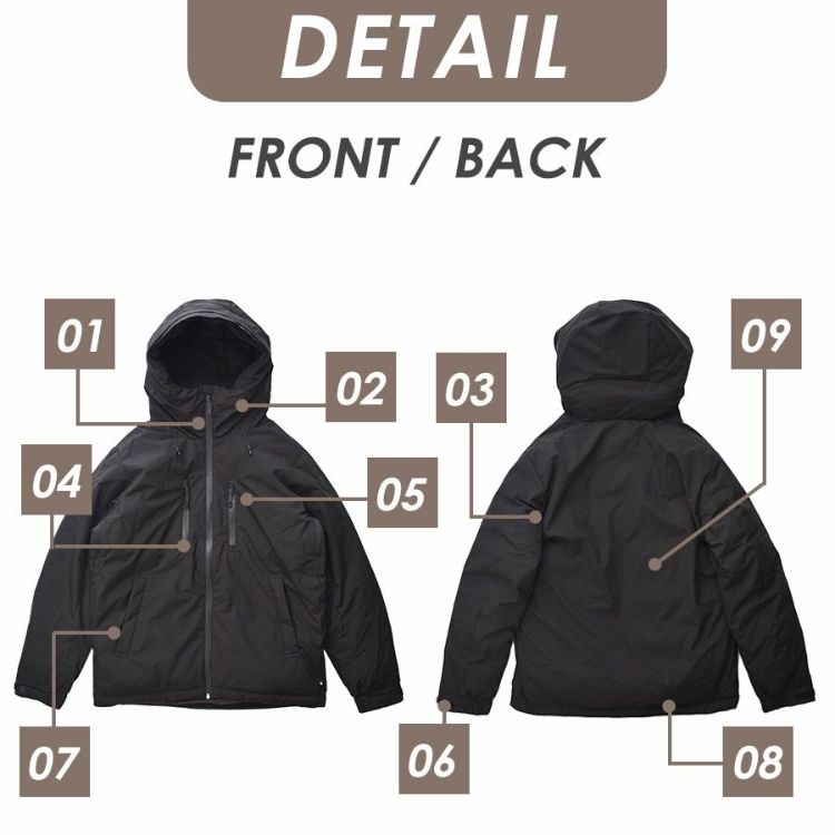 表生地は耐久撥水加工を施し、洗濯後も撥水力が持続します。(防水ではありません) 縫い目には防水加工をしていませんので完全防水ではありませんが、 小雨やベチャ雪などの日も安心して着用頂けます。 ※長時間濡れ続けると縫い目から浸水する可能性がございますのでご注意ください。 同時に防風性も備えており、冷気をシャットアウトすることで暖かさを保ちます。