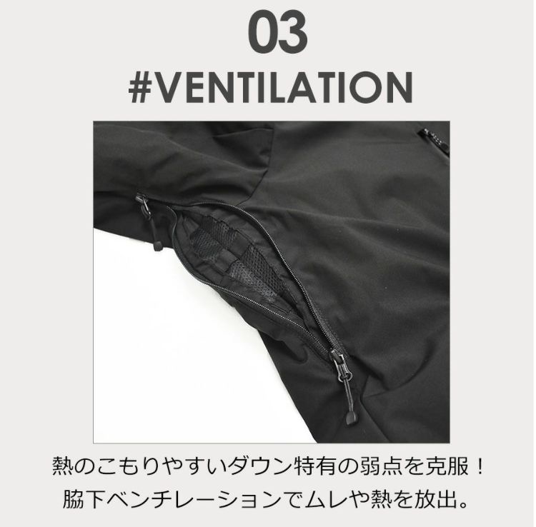 両脇下にムレを逃がす「ベンチレーション」機能は 脇下のファスナーで調整でき、ダウンを着用時のムレや熱を放出するので汗をかく作業時にも着用しやすいのが特徴です!