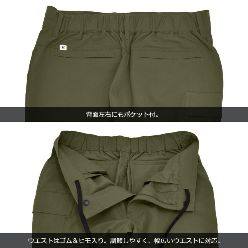 汗をかいてもべたつきにくい裏生地や動きやすい仕立て、ファスナー付きカーゴポケットや隠しマルチポケット付きなど、 快適な工夫が詰まったストレッチパンツ。