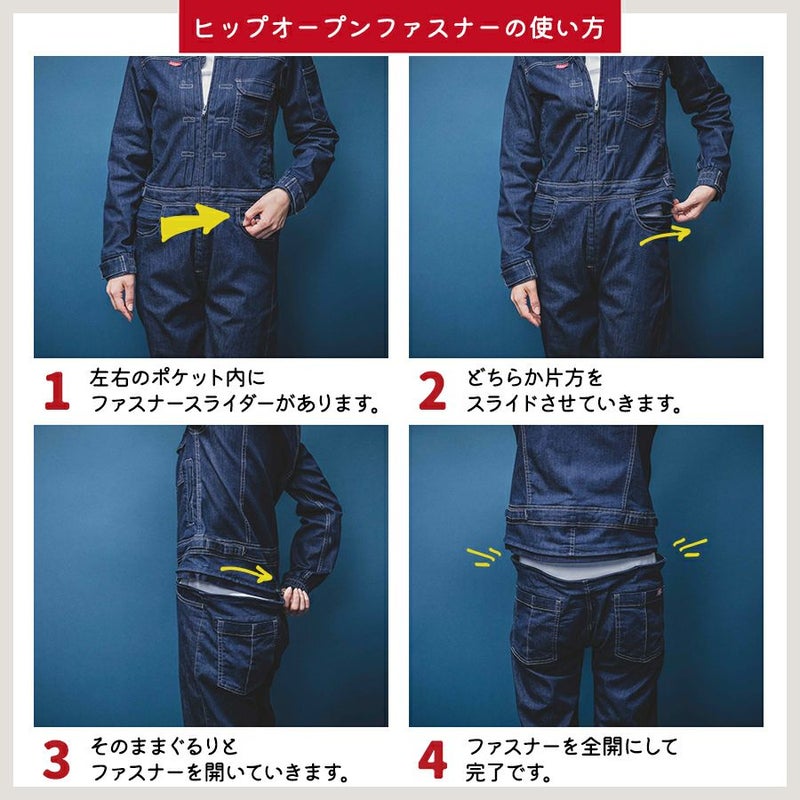 多くの女性の味方となったヒップオープン機能は当然の事、細部に宿らせた細やかな便利機能で、真の働く女性の味方になるツナギです。