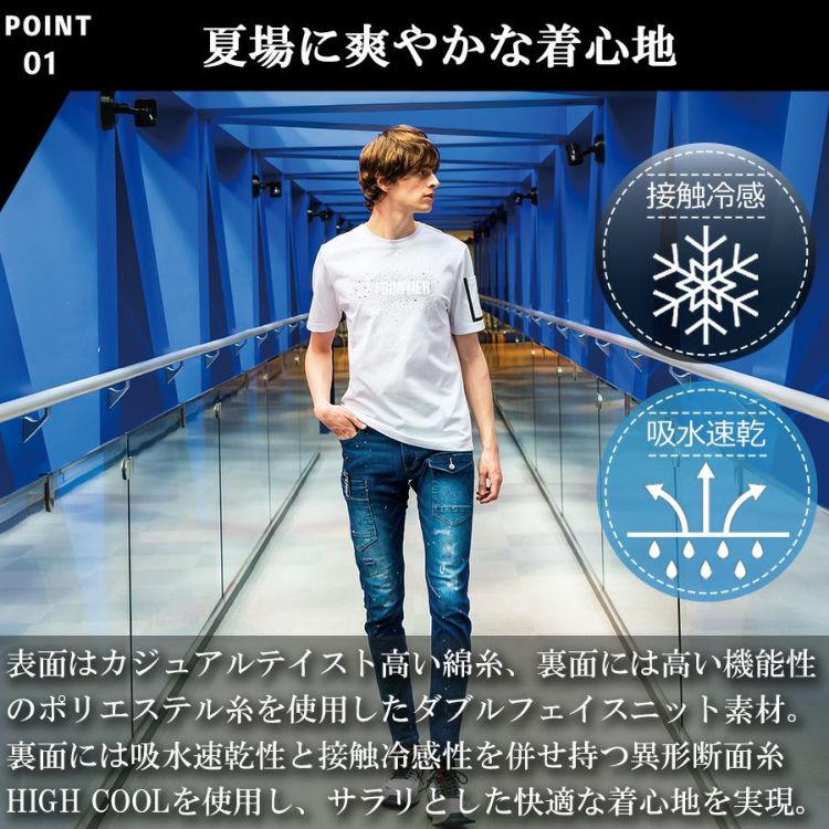 表面はカジュアルテイスト高い綿糸を、裏面には高い機能性のポリエステル糸を使用したダブルフェイスニット素材。 裏面には吸水速乾性と接触冷感性を併せ持つ異形断面糸HIGH COOLを使用し、サラリとした快適な着心地を実現。