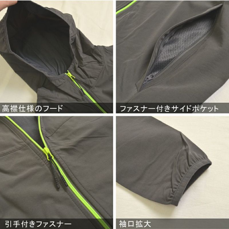 撥水・透湿・UVカットを備えた高機能素材「POINT touch」を使用したパーカーは、 軽量で伸縮性が高いので、普段使いから体を動かすお仕事やスポーツなど様々なシーンで活躍します。