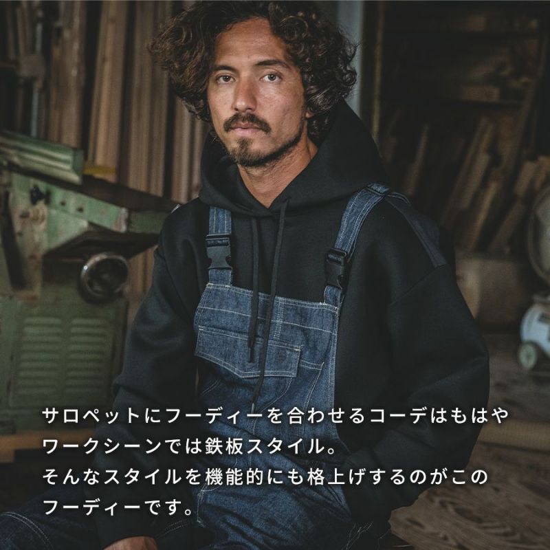 サロペットにフーディーを合わせるコーデはもはやワークシーンでは鉄板スタイル。