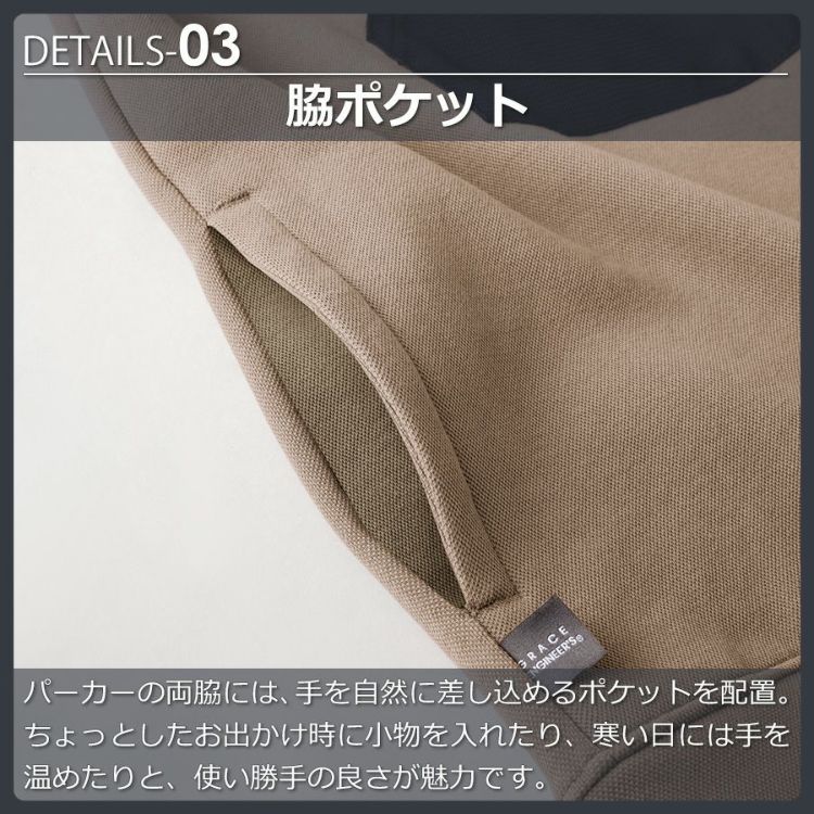 パーカーの両脇には、手を自然に差し込めるポケットを配置。ちょっとしたお出かけ時に小物を入れたり、寒い日には手を温めたりと、使い勝手の良さが魅力です。