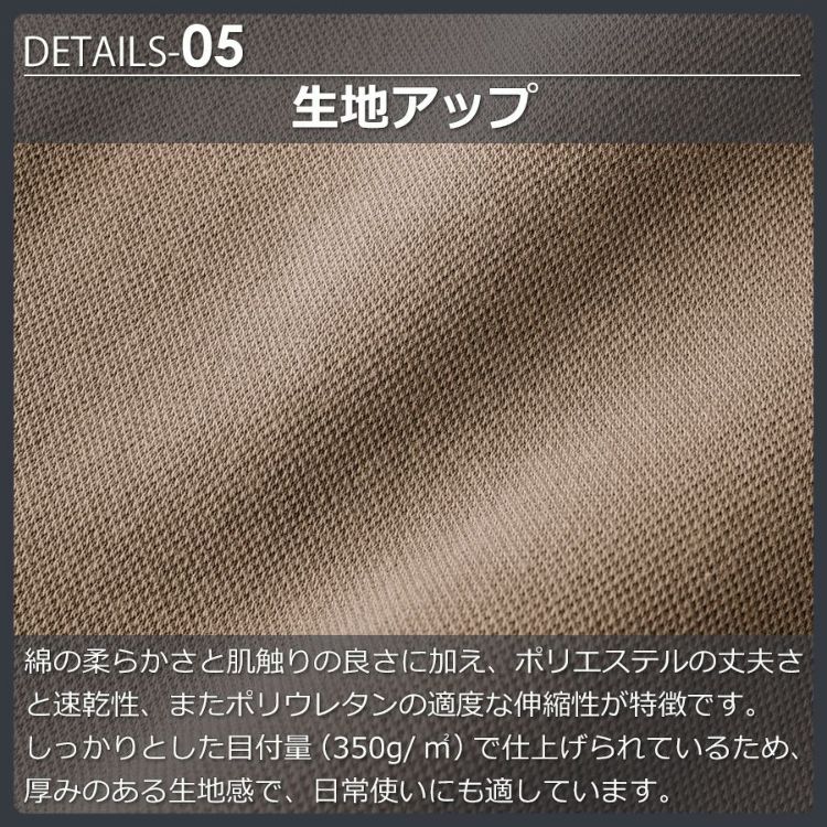 綿の柔らかさと肌触りの良さに加え、ポリエステルの丈夫さと速乾性、またポリウレタンの適度な伸縮性が特徴です。