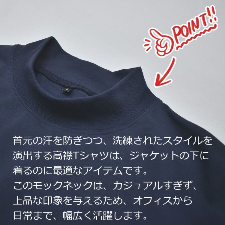 ・首元の汗を防ぎつつ、洗練されたスタイルを演出する高襟Tシャツは、ジャケットの下に着るのに最適なアイテムです。