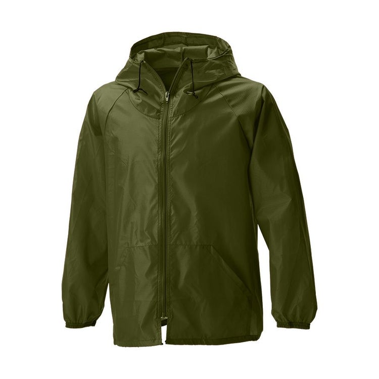 破れに強いリップストップ生地・軽量かつ丈夫なナイロン素材・防風・着脱しやすいフロントジップパーカータイプ・フード付き