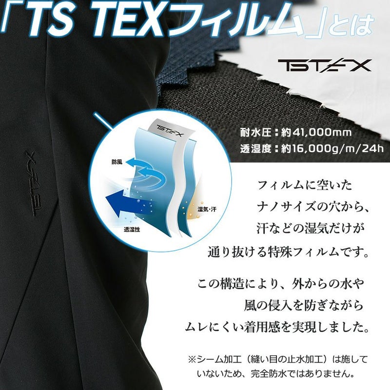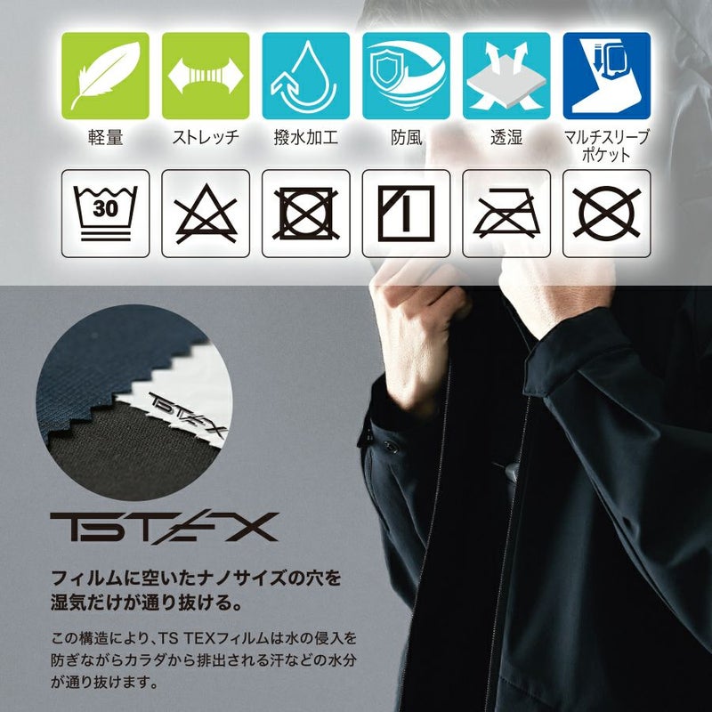 水の侵入を防ぎながら、ナノサイズの穴から体から排出される汗などの湿気だけが通り抜ける特殊フィルム「TS TEX」により、防風(風を通さず暖かい)・高透湿(ムレにくい)・耐水(水を通しにくい)を実現
