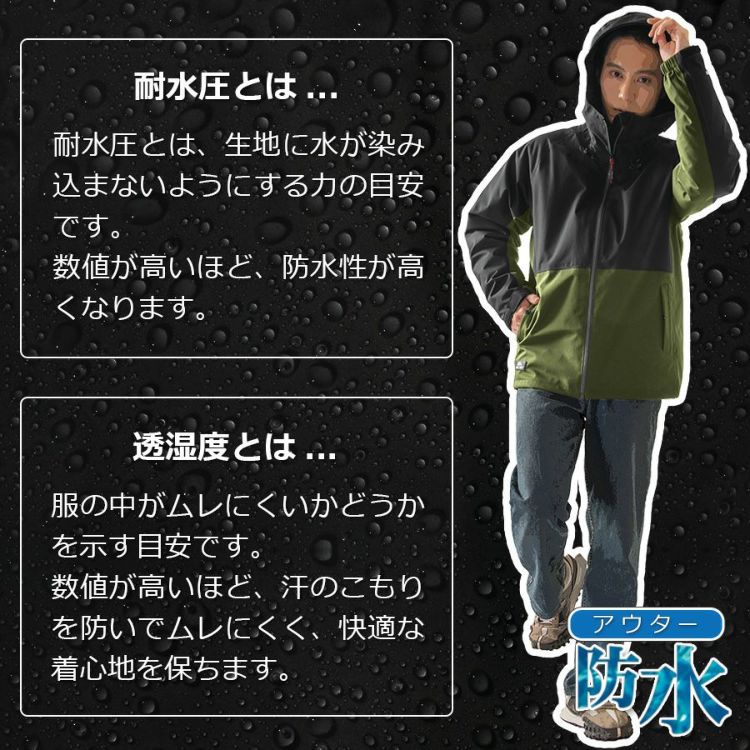 アウターは、嵐にも対応可能なレベルの高い防水性(耐水圧20,000 mmH2O以上)を誇ります。 また、透湿度20,000 g/m2-24h以上という高い透湿性で、屋外作業はもちろん、登山やスポーツなど、アクティブなシーンでの着用にもおすすめです。
