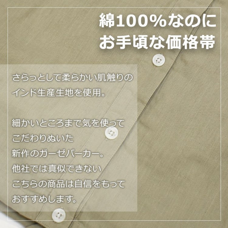 コットン 綿100% ガーゼ ダブルガーゼ Wガーゼ パーカー UVカット 羽織 農家 農業 ガーデニング 通気性 涼しい 肌触りが良い インド綿