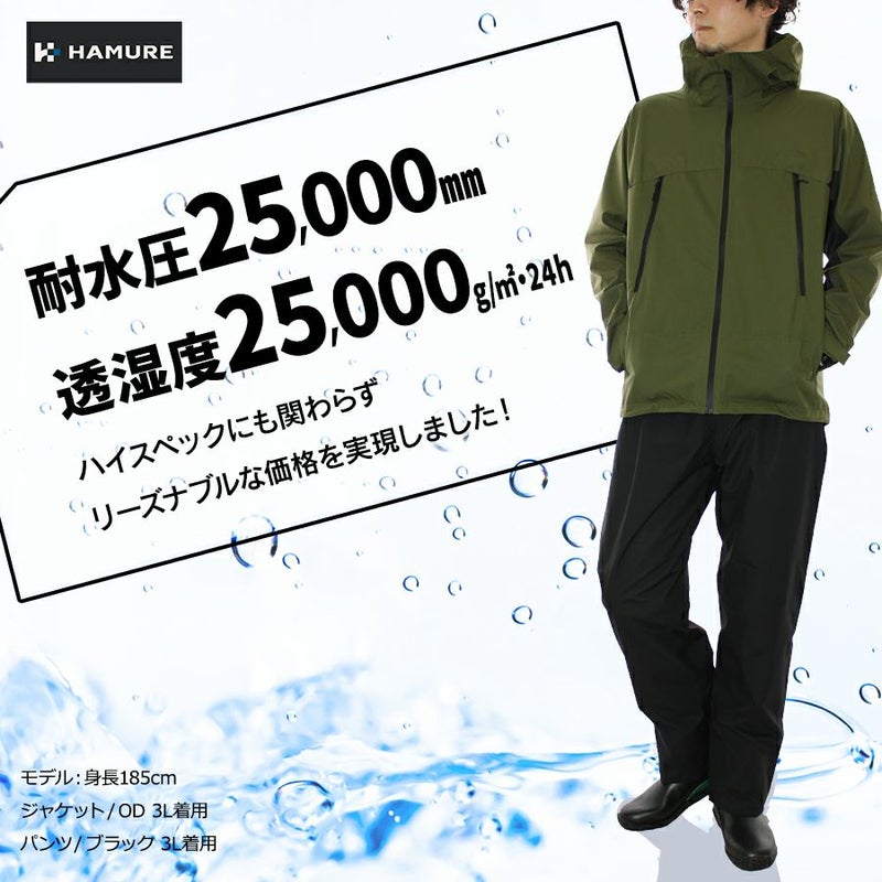 防水(耐水圧25,000㎜)、通気性(透湿度25,000g/㎡・24h)