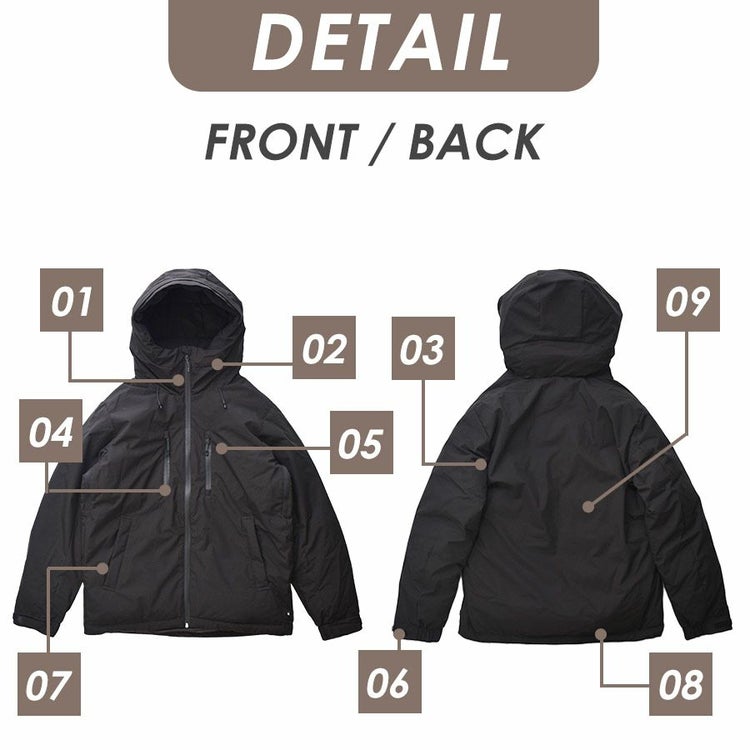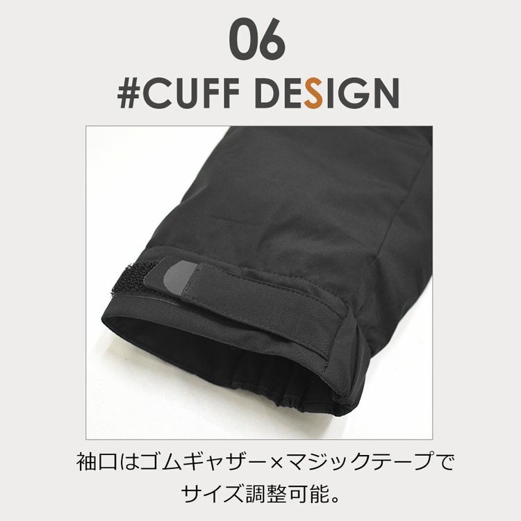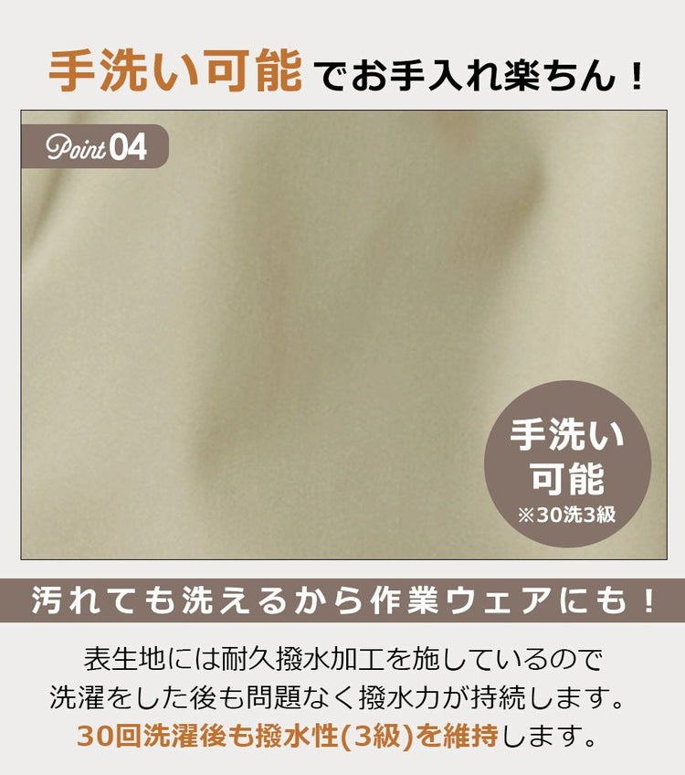 表生地は耐久撥水加工を施し、洗濯後も撥水力が持続します。(防水ではありません) 縫い目には防水加工をしていませんので完全防水ではありませんが、 小雨やベチャ雪などの日も安心して着用頂けます。 ※長時間濡れ続けると縫い目から浸水する可能性がございますのでご注意ください。 同時に防風性も備えており、冷気をシャットアウトすることで暖かさを保ちます。