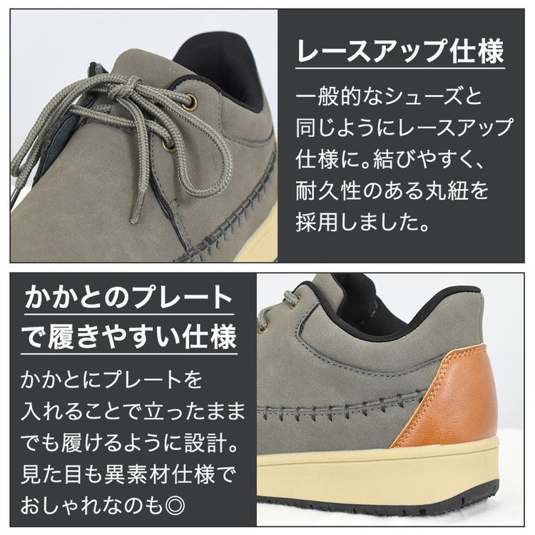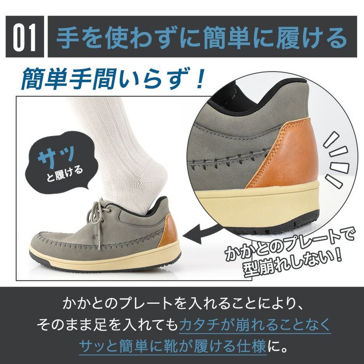 かかとにプレートが入っていることで、カタチをしっかりと保ってくれるので立ったまま、屈んだ状態でも手を使わずに簡単に履く事ができます。