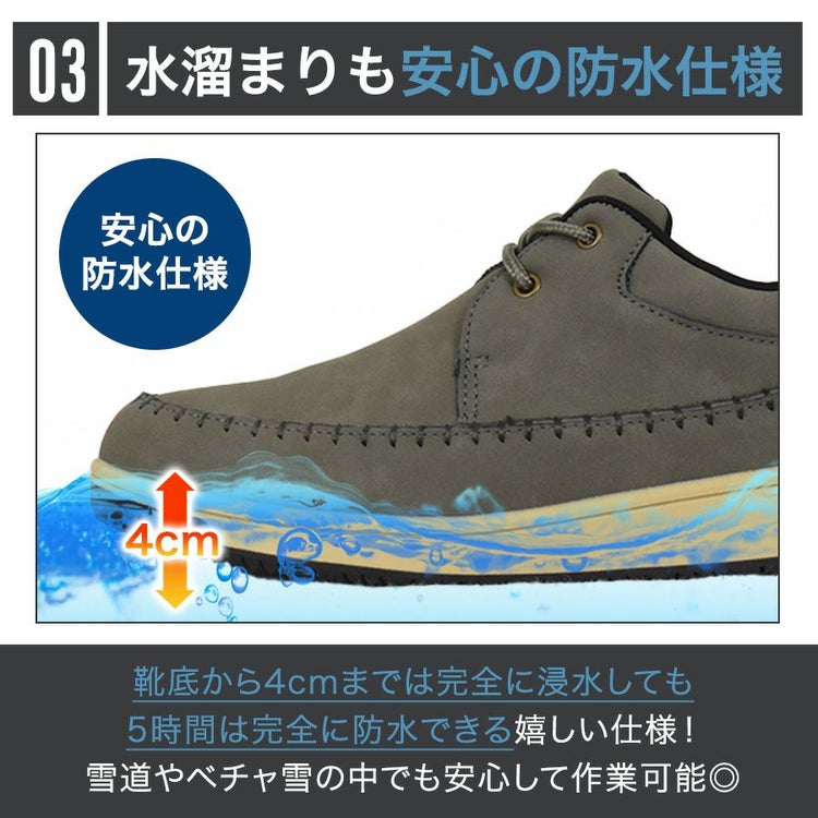 靴底から4cmまでは完全に浸水しても 5時間は完全に防水できる嬉しい仕様です! 雪道やベチャ雪の中でも安心して作業可能◎