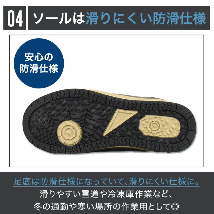 足底は防滑仕様になっていて、滑りにくい仕様です。 滑りやすい雪道や冷凍庫作業など、 冬の通勤や寒い場所の作業用として◎