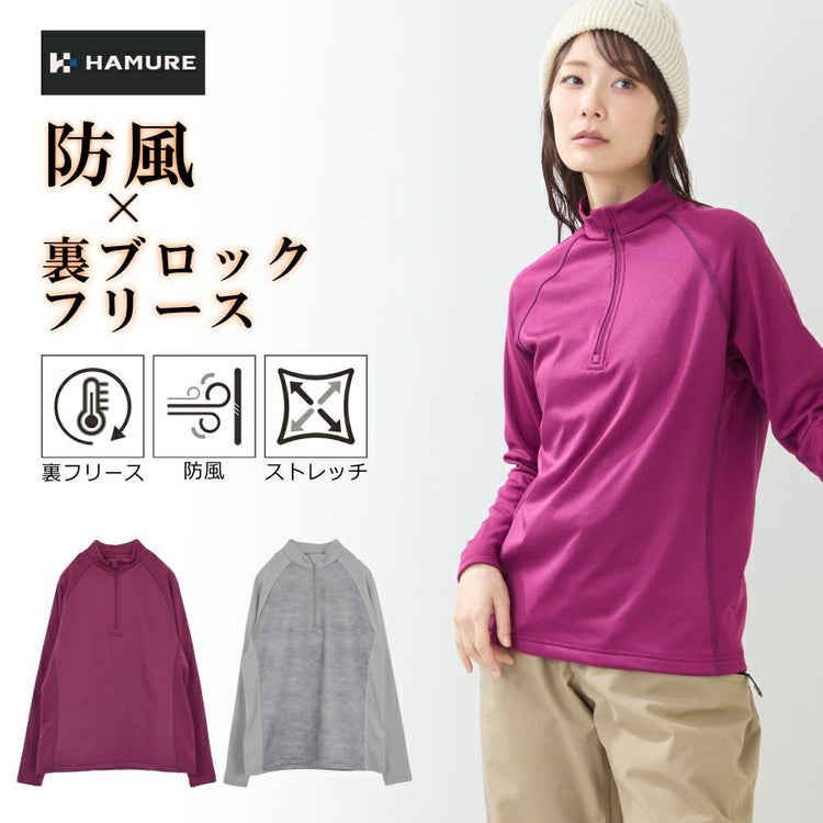 ハミューレ レディース 防風ハーフジップシャツ HMU-2550 防寒 裏フリース トップス ストレッチ 秋 冬 仕事 作業 スポーツ プロノ