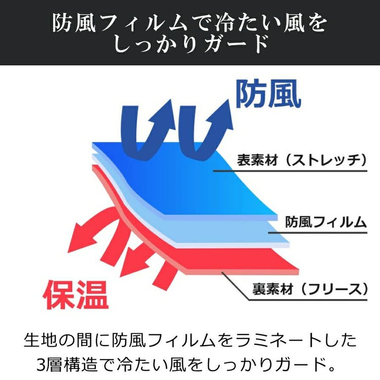 防風フィルムを挟んだ3層構造で冷たい風をしっかりガードし、内側にはブロックフリース素材を採用。