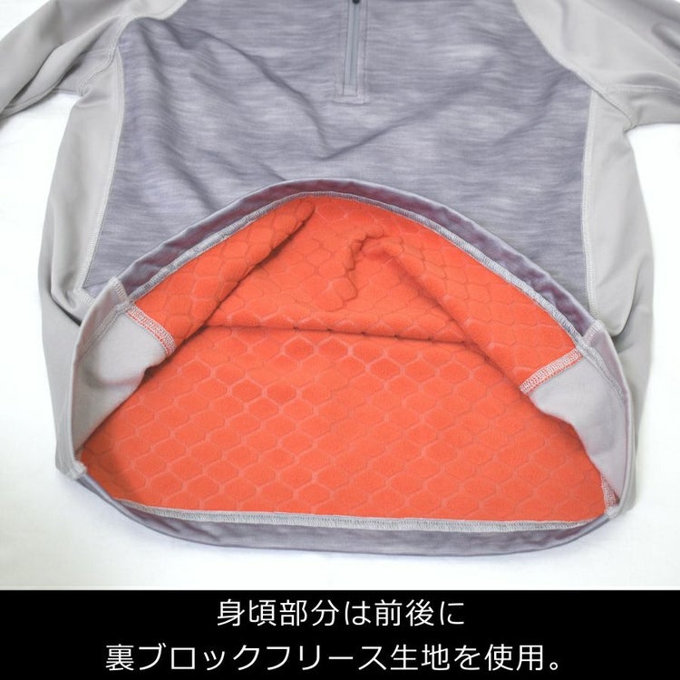 胸元のハーフジップで温度調節も簡単。袖や脇部分も裏起毛仕様でしっかり暖かい着心地です。