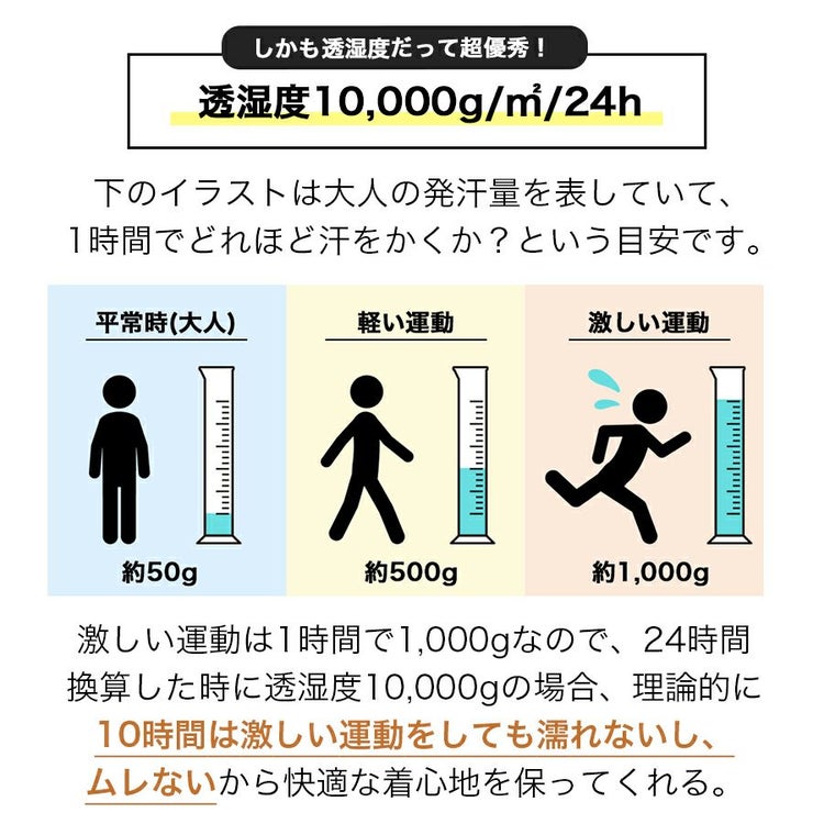 ■透湿性10,000gだからムレにくく快適な着心地