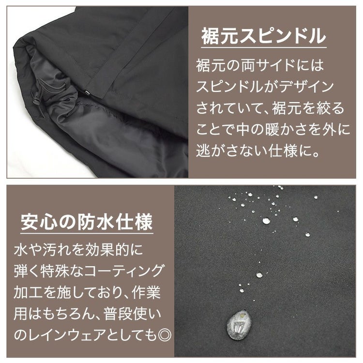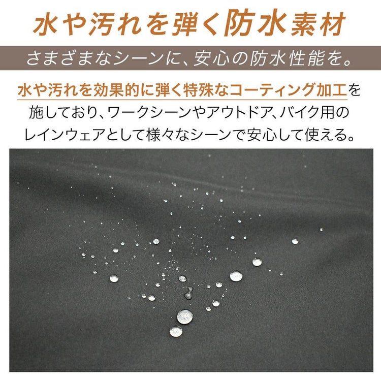 水や汚れを効果的に弾く特殊なコーティング加工を 施しており、ワークシーンやアウトドア、バイク用の レインウェアとして様々なシーンで安心して使える。