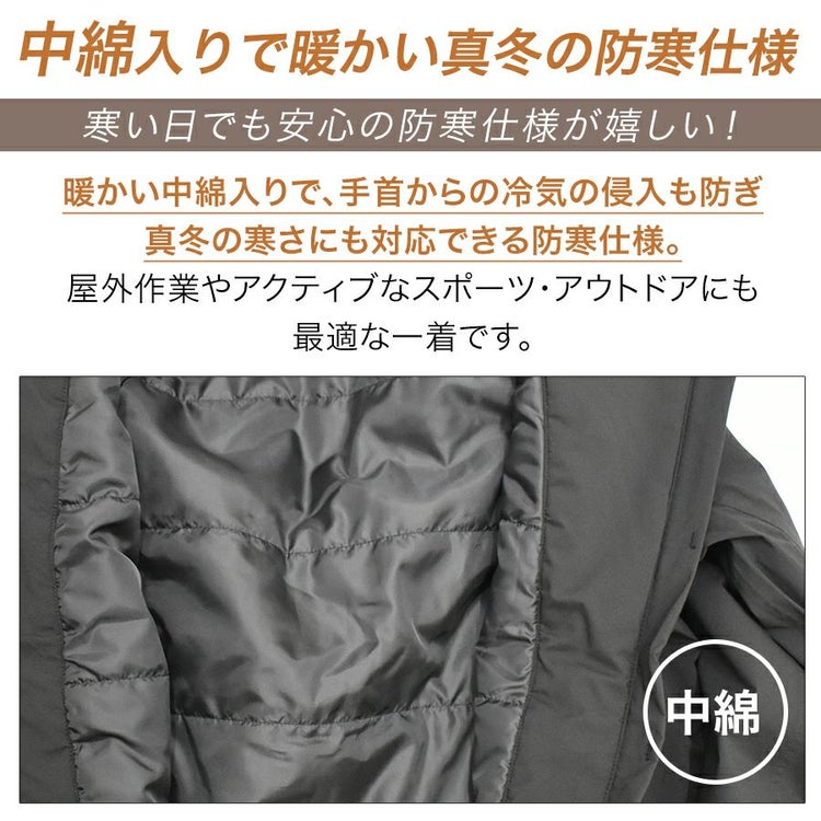 暖かい中綿入りで、手首からの冷気の侵入も防ぎ 真冬の寒さにも対応できる防寒仕様になります。 屋外作業やアクティブなスポーツ・アウトドアにも 最適な一着です。