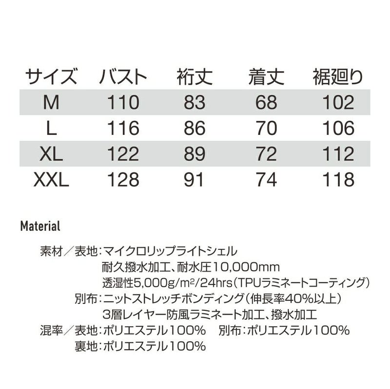 素材/ 表地: マイクロリップライトシェル、耐久撥水加工、耐水圧10,000mm、透湿性5,000g/m2/24hrs(PUラミネートコーティング)