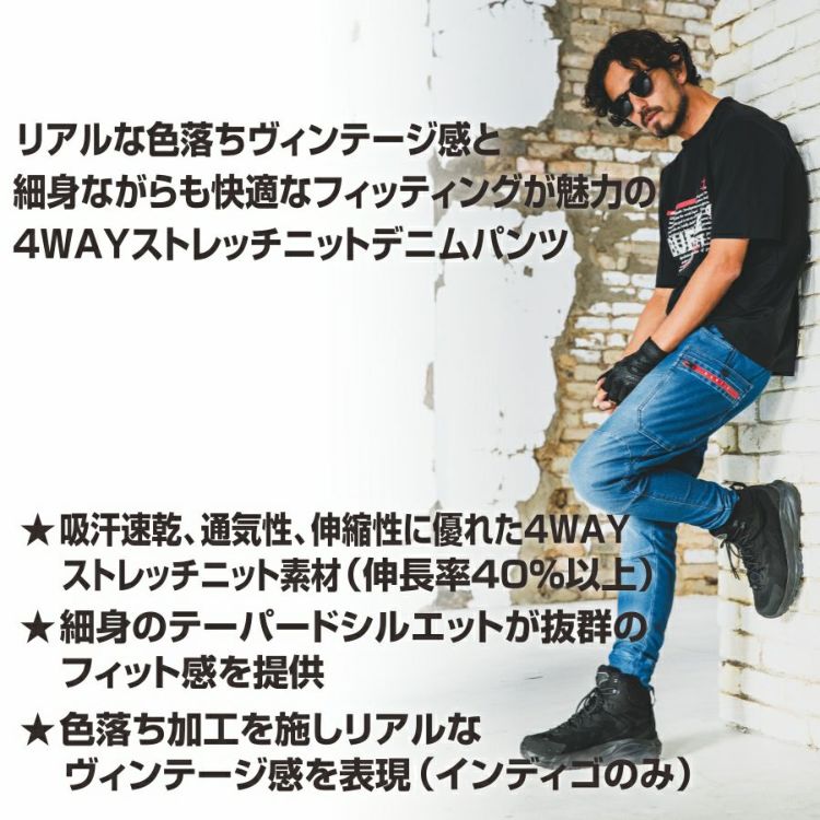 リアルな色落ちヴィンテージ感と細身ながらも快適なフィッティングが魅力の4WAYストレッチニットデニムパンツ
