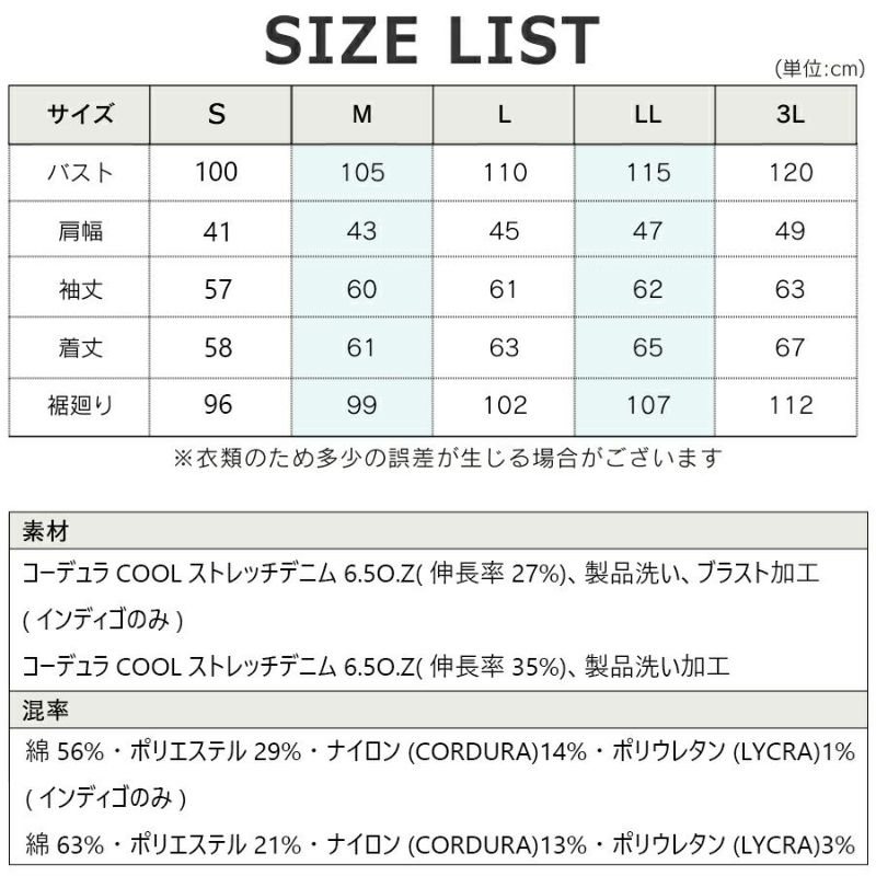 混率: 綿56%・ポリエステル29%、ナイロン(CORDURA)14%、ポリウレタン(LYCRA)2%(インディゴのみ)