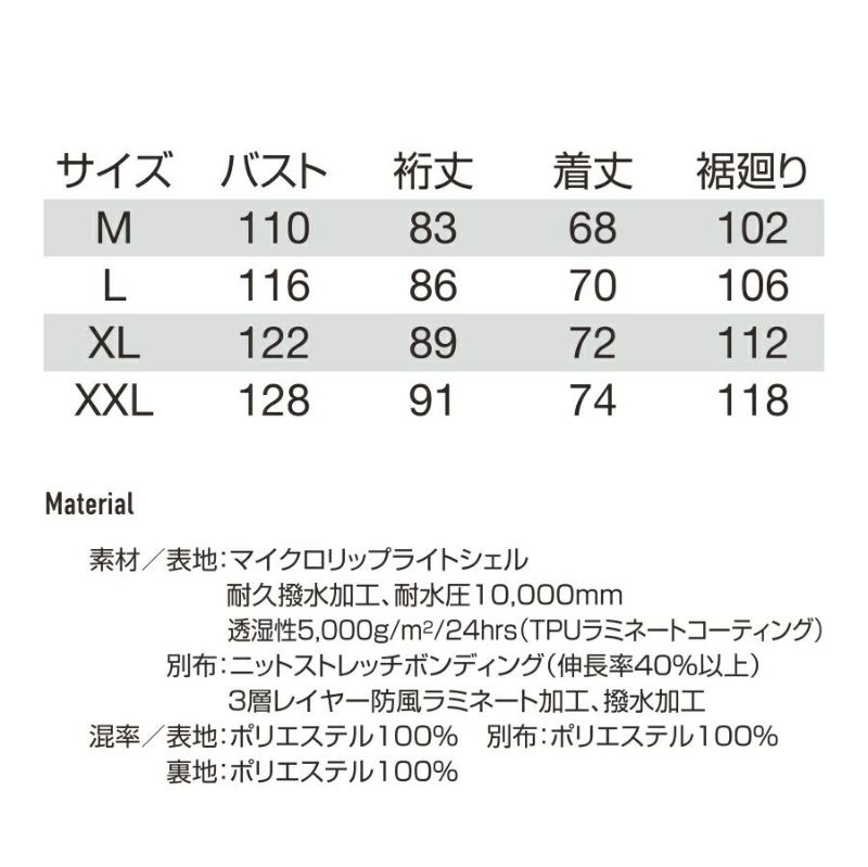 素材/ 表地: マイクロリップライトシェル、耐久撥水加工、耐水圧10,000mm、透湿性5,000g/m2/24hrs(PUラミネートコーティング)