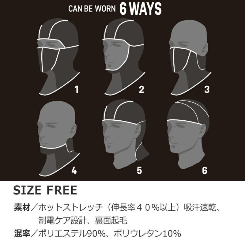 寒い中でのワークシーンに欠かせない保温性とドライな着用感が快適に持続するストレッチ素材のバラクラバ。