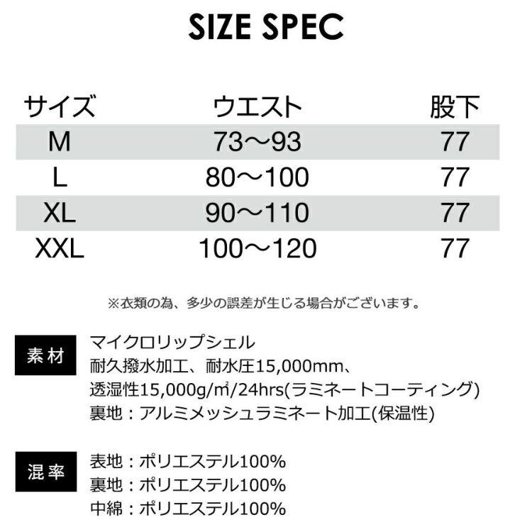 耐水性・透湿性・撥水性すべてを兼ね備えた防風防水防寒パンツになります。