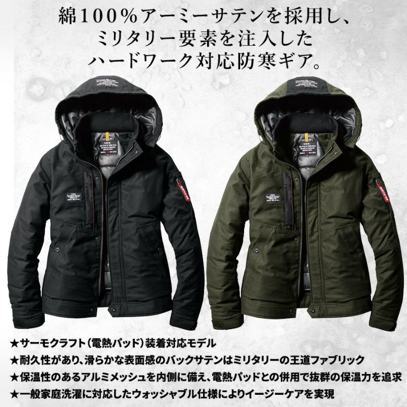 綿100%アーミーサテンを採用し、ミリタリー要素を注入したハードワーク対応防寒ギア。