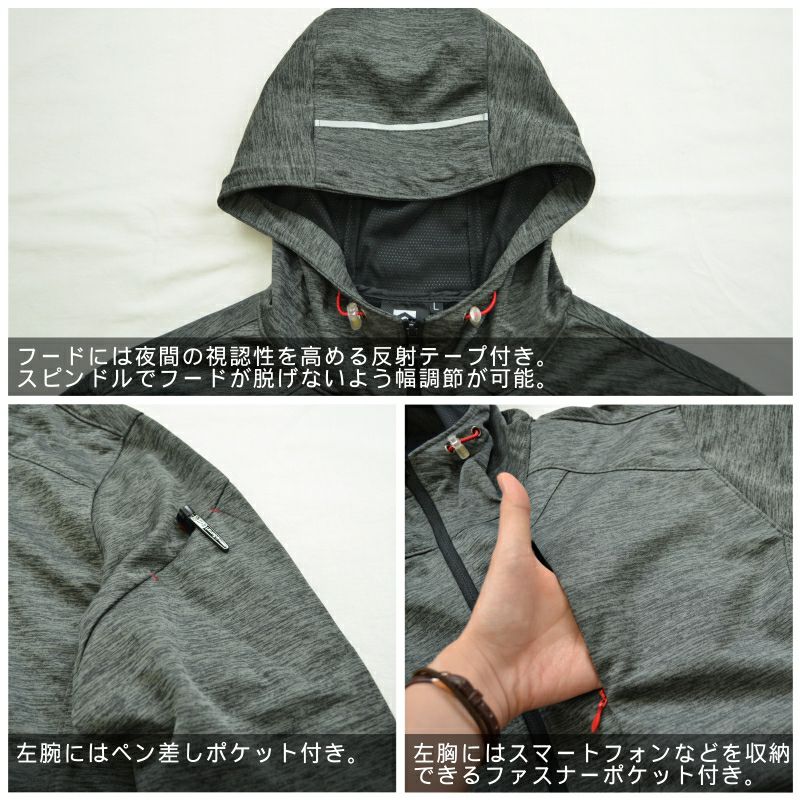 このパーカーなら、防風で体感温度をアップさせるだけでなく、ストレッチ素材なので動きも妨げません。